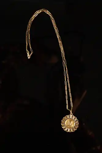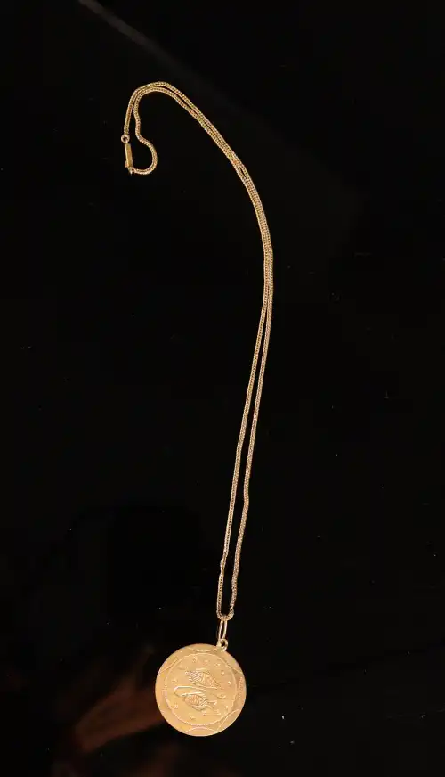Médaille ronde en or jaune 18 K (750) à motif de deux poissons et chaîne en or jaune 18 K (750). Poids : 10.46 g