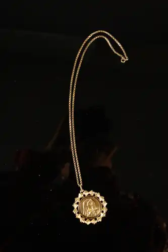 Pendentif médaille figurant la Vierge et chaîne en or 18 K (750). Poinçons hibou. Poids : 26.42 g