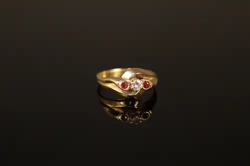 Bague en or jaune 18 K (750) sertie d'un diamant taille briallant entouré de deux rubis. TDD: 60. Poids brut : 5.05 g
