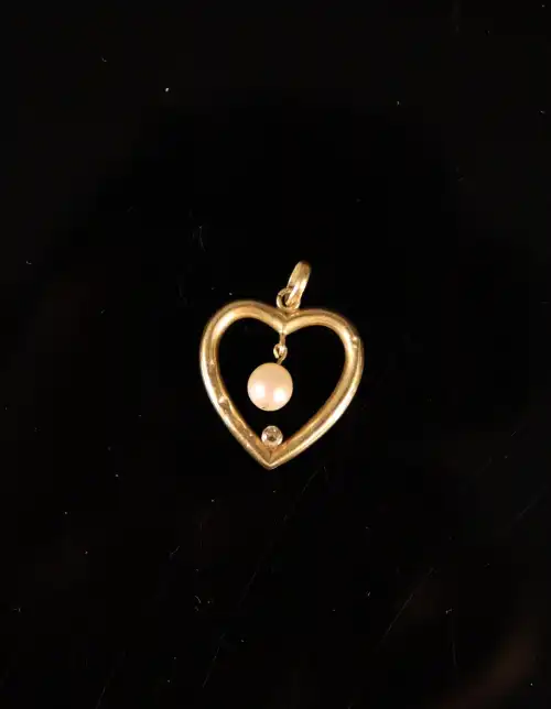 Pendentif coeur en or 18 K (750) sertie d'un petit diamant et retenant une perle an pampille. Poinçon charançon. Poids brut : 1.03 g