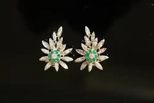 Paire de clips d'oreilles en or gris 18 K (750) à motif de fleurs, sertis d'émeraudes et de diamants de taille brillant. Poinçon hibou. Poids brut : 12.19 g