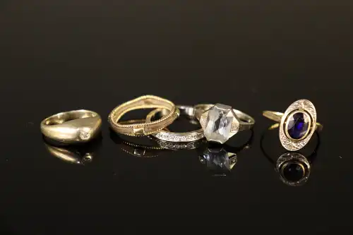 Lot de bagues en or 18 K (750) : deux bagues serties d'une pierre bleue, un anneau, une bague ornée d'un poil d'éléphant et bague sertie d'un petit diamant. Poids brut : 14.15 g