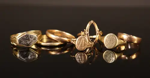Lot de bijoux en or jaune 18 K (750), comprenant :quatre alliance, une monture de bague et deux chevalières (dont une accidentée). Poids : 19.95 g