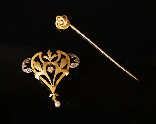 Lot de deux bijoux en or jaune 18 K (750) : - Broche en forme de coeur feuillagé sertie en son centré d'un diamant taillé en triangle, de petits diamants taillés en rose aux épaulements et retenant une petite perle en pampille. Poinçon tête d'aigle.