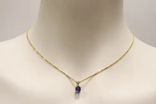 Pendentif en or gris 18K (750) orné d'un saphir ovale calibrant environ 1,10 ct (pierre probablement traitée thermiquement, légère rayure sur la table), en serti 4 griffes, la bélière ornée de 2 diamants taille brillant (un manquant). Il est retenu par une chaîne en or jaune 18K (750 maille forçat. Poinçon de M-O "Sté V" sur le pendentif. Poids brut : 4,4 g. Chaîne à charge de contrôle.