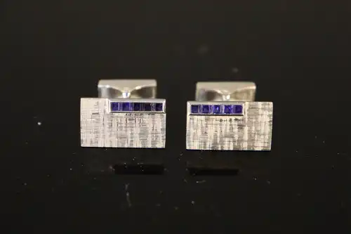 Paire de boutons de manchettes en or gris 18 K (750) à fond guilloché, sertis d'une ligne de cinq saphirs calibrés. Poinçon tête d'aigle.