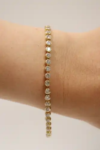 Bracelet ligne en or jaune 18K (750) à maillons articulés, chacun orné d'un diamant taille brillant en serti clos, avec sa chaînette de sécurité. Poids total des diamants : 3,40 carats environ. Longueur : 18,5 cm environ. Poinçon de M-O "Sté .A". Poids brut : 9,3 g.