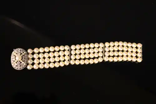 Bracelet à quatre rangs de perles, le fermoir ovale en or gris 18 K (750) serti de 30 diamants de taille brillant de 0.1 à 0.2 carat chacun, ponctués de perles. Poids brut : 64.9 g