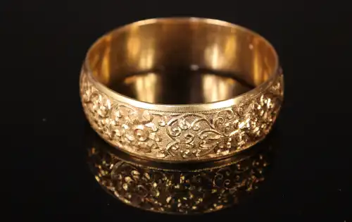 Jonc en or jaune 18 K (750) à décor ciselé de fleurs et d'enroulements. Poinçon tête de cheval. Poids : 199.8 g