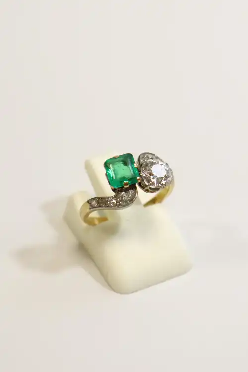 Bague "Toi et Moi" en or jaune 18K (750) et platine (850) ornée d'un diamant taille ancienne calibrant environ 0,55 ct ainsi que d'une émeraude rectangulaire à pans coupés (usures aux arêtes, égrisures), les attaches serties de diamants taille ancienne en chute. Porte un numéro d'inventaire dans l'anneau, anneau fendu suite à mise à taille : à re-souder. Vers 1910. TDD 49 environ. Poids brut : 2,7 g.