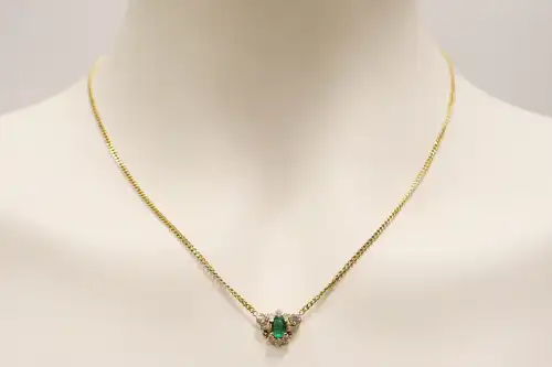 Collier en or jaune 18K (750) à maille gourmette, le motif central orné d'une émeraude ovale (usures et fêles affleurants, traces de résine possibles) dans un entourage de diamants taille brillant et taille tapers. Poids brut : 6 g.