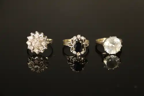 Lot de trois bagues en or gris 18 K (750), l'une serties de pierres. TDD : 55 et 56. Poinçons Tête d'aigle. Poids brut total : 13.83 g.