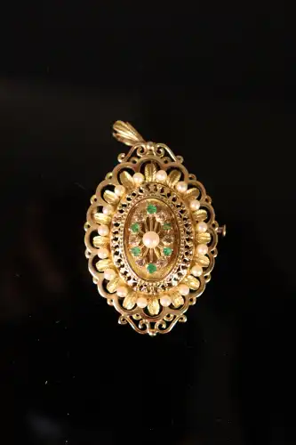 Broche formant pendentif en or jaune 18 K (750) à monture ovale ajourée sertie de petites perles et petites pierres à motif de feuilles ciselées. Poinçon Tête d'aigle. Poids brut : 19 g