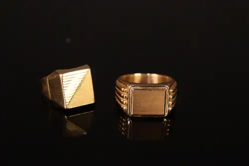 Deux chevalières en or jaune 18 K (750). TDD : 60 et 61. Poinçons tête d'aigle et hibou. Poids : 20.99 g.