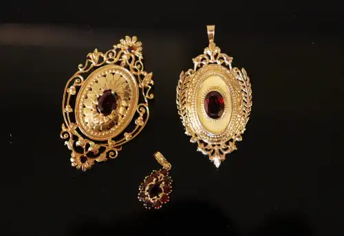 Lot de trois bijoux en or jaune 18 K (750) sertis de grenats , comprenant deux proches formant pendentif et un petit pendentif. Poinçons tête d'aigle et charançon. Poids brut total : 21.28 g