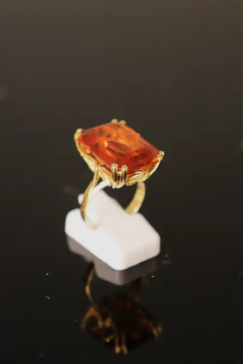 Bague en or jaune 18 K (750) sertie d'une pierre orange de taille émeraude. TDD : 55. Poinçon Tête d'aigle. Poids brut : 10.4 g