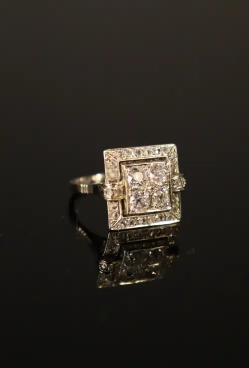 Bague carrée en or gris 18 K (750) à monture ajourée de forme Art Déco, sertie de quatre diamants de taille ancienne d'environ 0.2 carat chacun, l'entourage pavé de petits diamants taillés en rose. Poids brut : 4,4 g