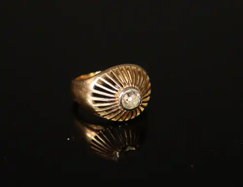 Bague en or jaune 18 K (750) de forme de dôme ajouré centré d'un diamant en serti clos de taille ancienne d'environ 0.3 carat. Poids brut : 5,85 g