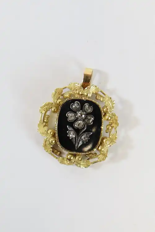 Pendentif en or jaune 18 K (750) orné d'une rose sertie de brillants sur fond émaillé noir. Poids brut : 4.6 g