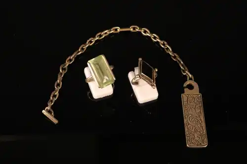 Lot de bijoux en argent 925/1000 comprenant une chaînette de montre avec pendentif, une bague sertie d'une pierre noire et une bague sertie d'une pierre verte (accidentée). Poids brut : 32.23 g