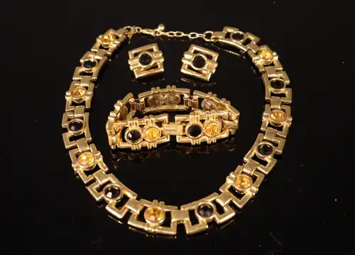 LERITZ. Parure en métal doré à maillons articulés ornés de pierres noires et jaunes, comprenant : collier, bracelet et paire de clips d'oreilles. Le collier signé.