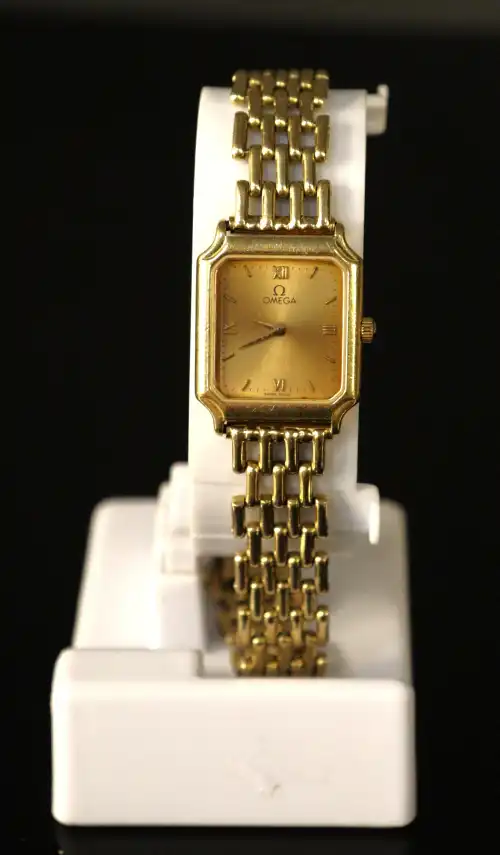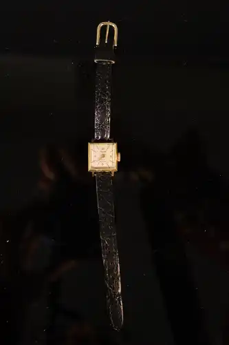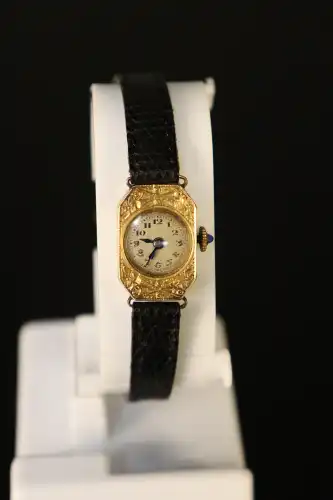 Montre de dame des années 1950 en or 18K (750) à boîtier octogonal à décor de fleurs. Cadran rond à chiffres arabes. Mouvement KFG 575. Bracelet neuf en lézard et boucle en métal doré. En état de marche. Poids brut : 8.33 g