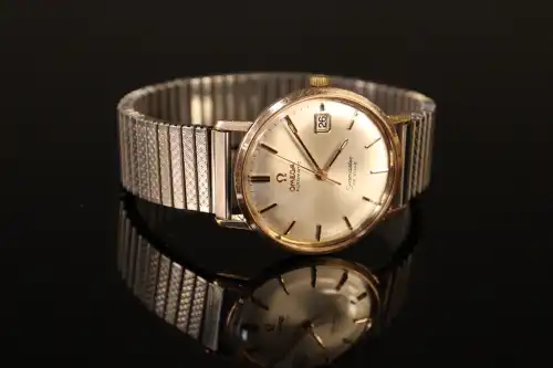 OMEGA. Modèle Seamaster. Montre bracelet d'homme en acier, les anses la lunette laminés d'or jaune. Le cadran rond signé à fond argenté, index à bâtons, guichet dateur à 3h. Mouvement automatique. Bracelet rapporté en métal à mailles élastiques. En état de marche.