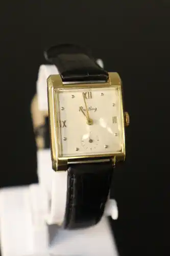 BRETLING. Montre d'homme à cadran carré en or jaune 18 K (750). Le cadran index points et chiffres romains dorés appliqués, compteur trotteuse à 6h. Mouvement mécanique, dos numéroté. En état de marche. Poids brut : 25.22 g