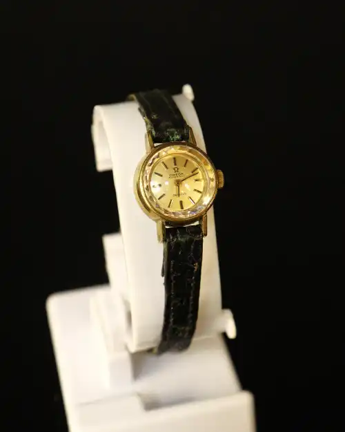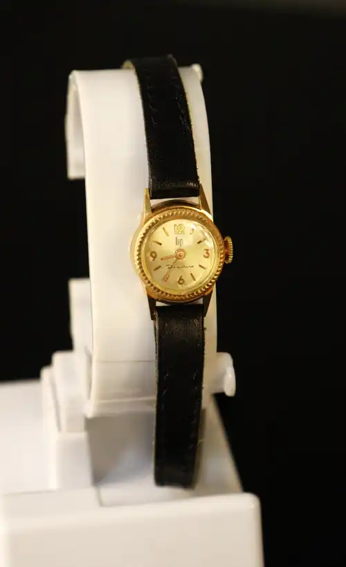 FAVRE-LEUBA. Montre de dame à boîtier rond en or jaune 18K (750) Le cadran signé à fond champagne, index bâtons dorés appliqués. Mouvement mécanique. Poinçon hibou. Bracelet neuf en cuir à boucle en métal. Montre révisée, en état de marche. Poids brut : 9.80