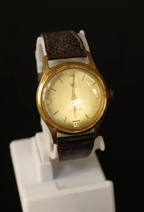 MONDIA. Montre bracelet d'homme en métal doré, le cadran signé à fond champagne, guichet dateur à 3h, index dorés. Mouvement mécanique, waterproof. Bracelet en métal doré.