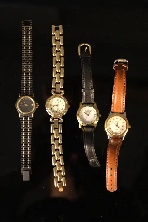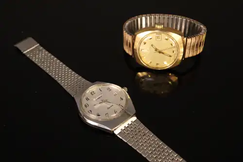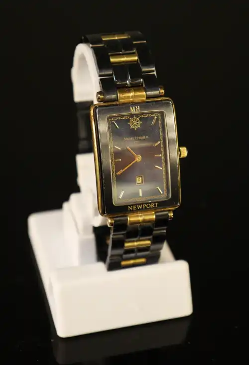 On joint : CITIZEN. Montre brecelet d'homme en métal. Modèle Seven. Cadran à chiffres romains et guichet dateur à 3h. Mouvement à quartz. Bracelet d'origine. (Usures au dos du boîtier)