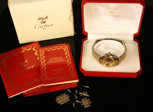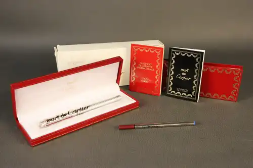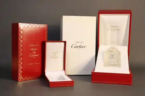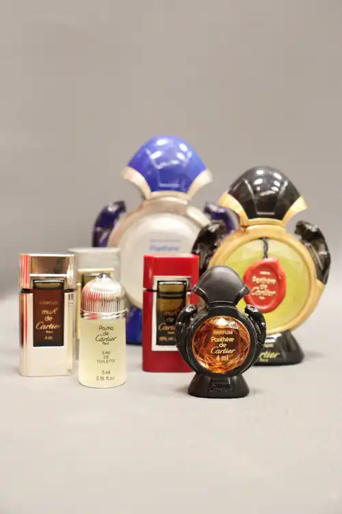 CARTIER. Ensemble de sept flacons dont « Panthère » (eau de toilette 50ml ; factice 30 ml ; parfum 4ml), « Must » (parfum et eau de toilette 4ml) et « Pasha » (eau de toilette 5ml).