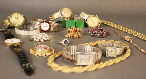 Lot de bijoux fantaisie, comprenant : collier et bracelet en malachite, boîtier de montre doré, paire de boutons de manchette, broches, bague avec turquoise, pendentif ours, colliers, joncs, porte-monnaie en métal et divers. (Usures d'usage)