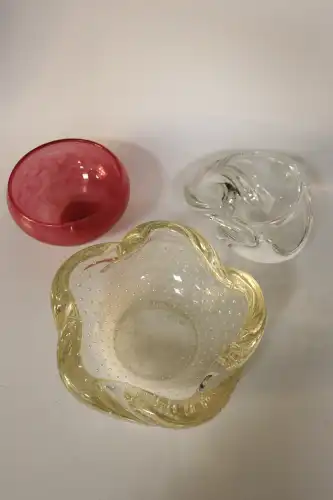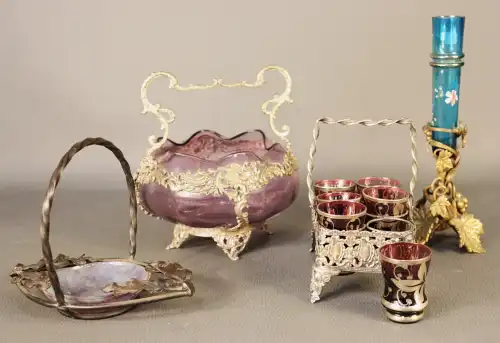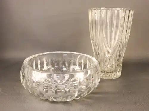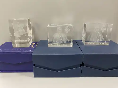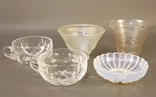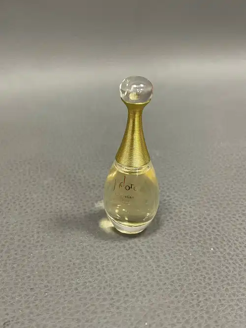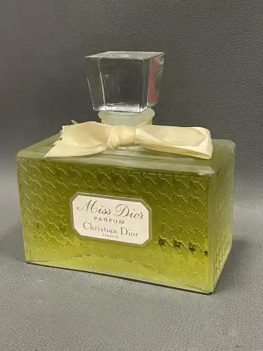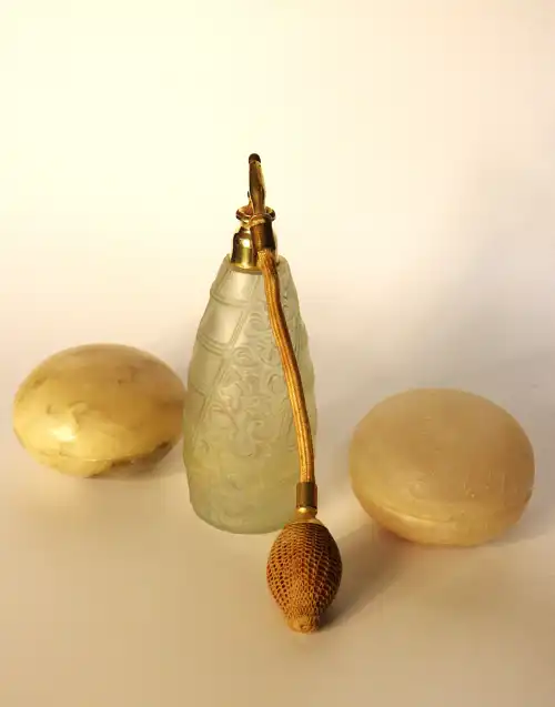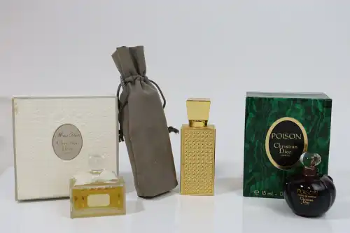 On joint : un flacon de parfum vide « Parfum Sacré » de CARON, une boîte en verre ROGER & GALLET et un flacon sans étiquette COURREGES.