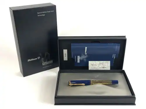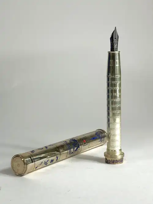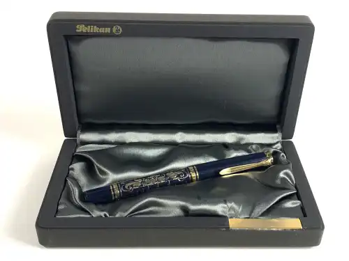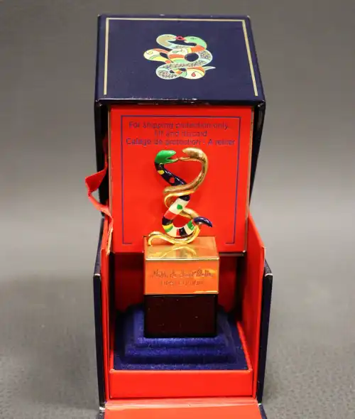 NIKKI DE SAINT PHALLE. Flacon de parfum bleu nuit "First Edition", bouchon en métal doré et émaillé formant serpents entrelacés. Dans son coffret, 7 ml.