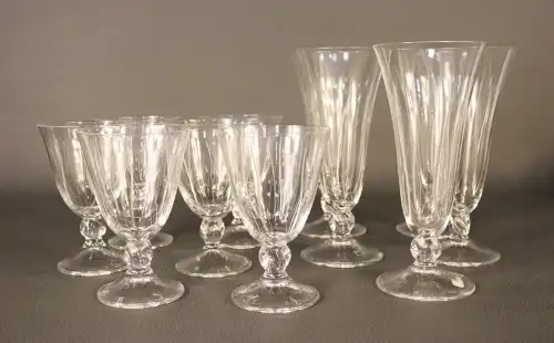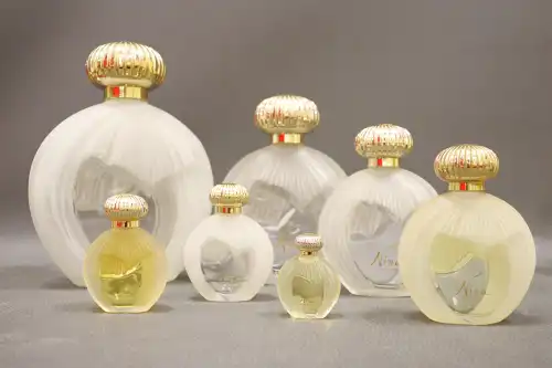 NINA RICCI. Ensemble de sept flacons LALIQUE, eau de toilette collection « Nina » (420ml à 5ml dont quatre vides).