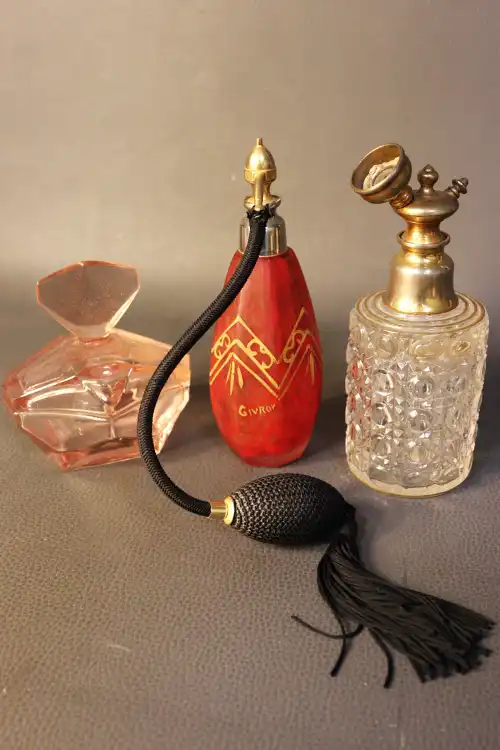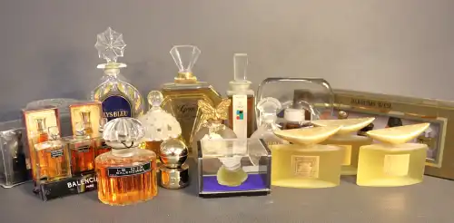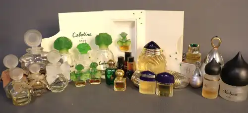 Lot de dix-sept flacons de parfums vintages comprenant : - Jean DESPREZ, deux "Bal à Versailles" n°152 et n°119 ; - SAUZE, "Gerbe d'oeillets" dans sa boîte ; - Estée LAUDER, "Cinnabar" 30 ml (plein) ; - Bruno COURT, "Extrait aux fleurs" ; - SAUZE Frères, "Fleurarome" (vide) ; - Flacon Jean PATOU (vide) ; - AVON, "To a wild rose" (vide) ; - RIGAUD, "Un air embrumé" (vide) ; - F. MILLOT, "Crêpe de Chine" ; - LUBIN, "Nuit de Lonchamps" ; - Jean PATOU, "Amour Amour" dans sa boîte ; - FORVIL, "Les Yeux doux" dans sa boîte ; - BALMAIN, "Jolie Madame" dans son pochon (plein) ; - "L'Aimant" (plein) ; - "Gioco di Fiori" (plein) ; - YVES ROCHER Flacon vaporisateur bleu (vide)
