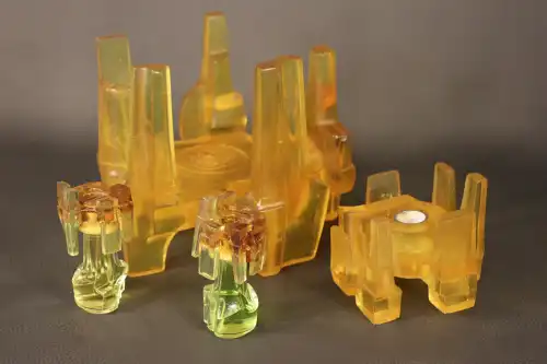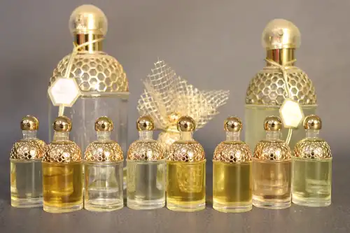 GUERLAIN. Lot de divers flacons de parfum en verre avec la représentation l’alvéoles et d’abeilles comprenant : - Un grand flacon vide en verre sans étiquette. Probablement 800 ml