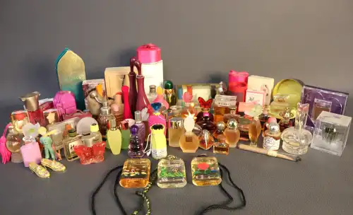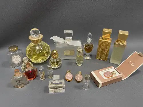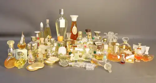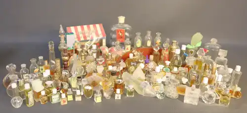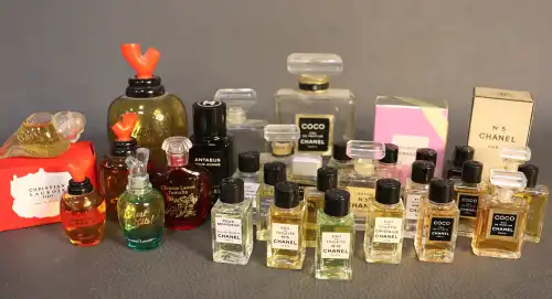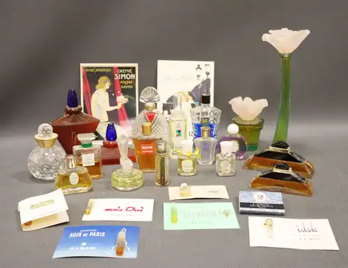 Ensemble de flacons et d’échantillons dont BOURJOIS PARIS (« Mais Oui », « Soir de Paris » et « Glamour »), CHRISTIAN DIOR (« Dolce Vita », vide), FENDI (factice), LANVIN (« Arpège »), ISADORA, ANAIS ANAIS, LESOURD (« Chypre »), BERDOUES, MOLYNEUX (« Rue Royale »), UNGARO (« Diva »), EAU DE CARON, MONSAVON (« Cuir »), YVES ROCHER (« 8e jour »), GARNIER (« Roja Flore »), LE GALION (« Sortilège »).