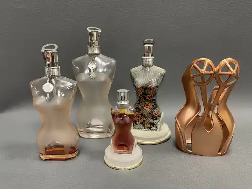 Jean Paul GAULTIER. Lot de quatre flacons de parfum "Classique" dont trois vides et un miniature. De 100 ml à 7,5 ml. On joint une gaine en métal rose pour buste féminin "Classique".