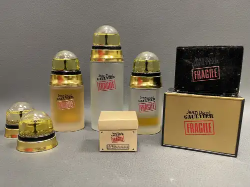 Jean Paul GAULTIER. Lot de trois flacons de parfum "FRAGILE" de 100 à 50 ml dont deux vides et trois boîtes du même parfum 7 ml: - Modèle "La Petite Malle Magique" ; - Modèle "Le Jeu de la Séduction" ; - Miniature dans sa boîte. On joint deux bouchons.