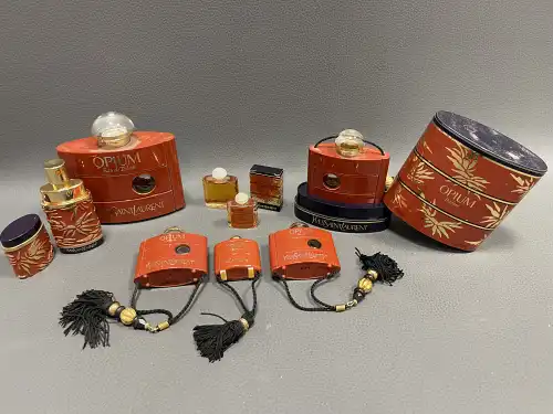 Yves SAINT LAURENT. Lot de deux flacons de parfum "Opium" vides dont un dans sa boîte, 60 ml et 15 ml. On joint sept miniatures dont un dans sa boîte, de 7,5 ml à 3,5 ml.