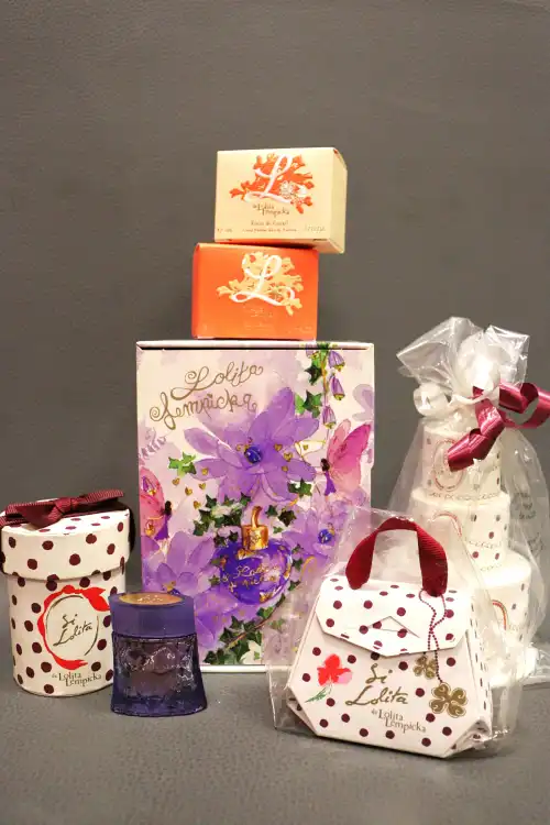 LOLITA LEMPICKA. Lot de six coffrets de parfum miniatures 5ml comprenant : - Modèle Coccinelle miniature ;- Sac "Si Lolita" ; - Pièce montée "Si Lolita" ; - Boîte "Si Lolita" ; - deux petites boîtes contenant "L" et "L Fleur de corail". On joint une miniature "Au Masculin" 5ml. Neuf