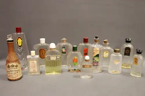 Lot de dix flacons d'eau de cologne comprenant les marques MOUCHOTTE, E. MILLOT, TOYE, "L'oeillet" de MOLINAR (bouteille remplie), "Cuir de Russie" de L.T PIVER, "Dans la nuit" de WORTH, "Ecusson" de JEAN D'ALBRET, "Eau de Cologne aux Fleurs" de LORENZY PALANCA, "Eau de fleurs d'oranger" de BORELLI, "Taquin" de FORVIL,