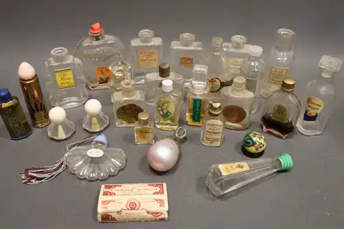 Lot de dix-neuf flacons de parfum et miniatures vintages comprenant : - BOURJOIS, "Soir de Paris" dans sa boîte ; - F. MOREAU & FILS, "Extrait de violette" (sans bouchon, vide) ; - "Con'regho di fiori" (?) (plein) ; - MONSAVON, "Chypre" ; - L.T PIVER, "Chypre", "Floramye" et "Oeillet frangé" ; - ROGER & GALLET, deux " Chypre", "Vera Violetta" ; etc. ... On joint une boîte "Robe d'un soir" de CARVEN, une boîte de cartes à jouer miniatures, FRAGONARD miniature de maquillage.