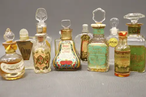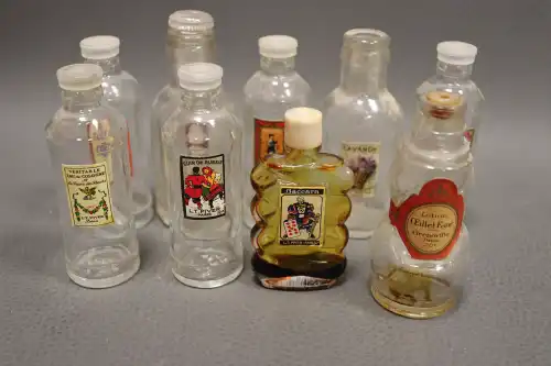 Lot de onze flacons de parfums vintages vides dont : - ED. PINAUD, "Bouquet de fleurs perse" ; - DANVERS & Cie, "Essence Reina Viola" plein ; - LORENZY PALANCA, "Frimousse d'Or" ; - ROGER & GALLET, "Heliotrope Blanc" ; - A. LARTIGUE, "Essence Triple" ; - VICTOR VAISSIER, "Essence du Congo" ; - Jn GIRAUD FILS, "Extrait concentré" ; etc. ...