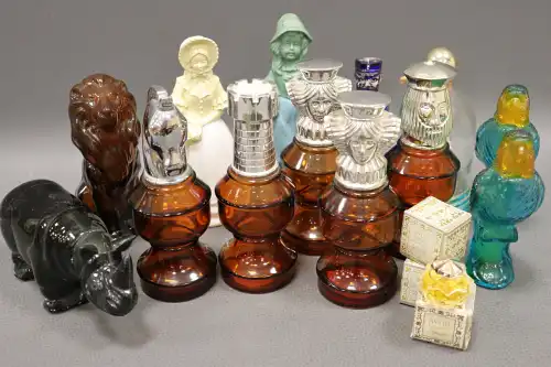 AVON COSMETICS. Lot de treize flacons de parfums, eau de cologne et after shave vides comprenant : - "Elegance" ; "Moonwind" ; - Flacon rhinocéros ; - Deux flacons figurines en porcelaine ; - Flacon gendarme ; - Cinq flacons 90 ml pièces d'échec ; - Flacon Bell Jar ; - "Avon Musk for Men" plein 75 ml. On joint trois miniatures de la marque comprenant "Elegance", "Topaze" et "Unforgettable" 4 ml.