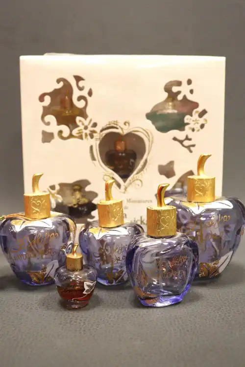 LOLITA LEMPICKA. Lot de cinq flacons de parfum "Lolita Lempicka Eau de Parfum" vide sauf le miniature, de 5 ml à 100 ml. On joint un coffret "Collection Miniatures" de la marque comprenant cinq miniatures, neuf.