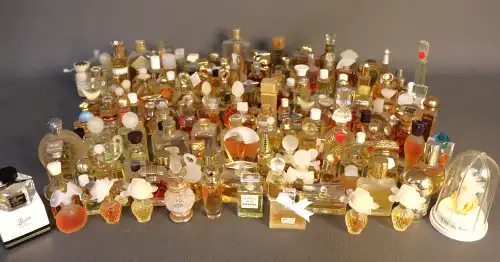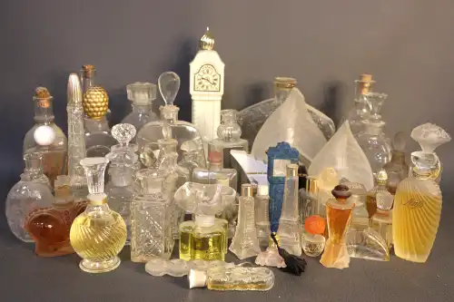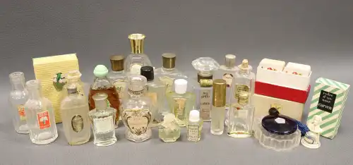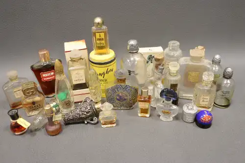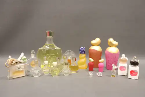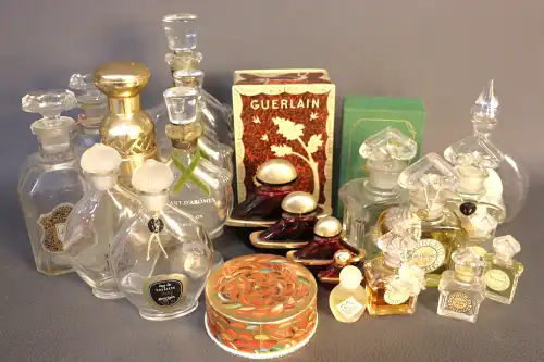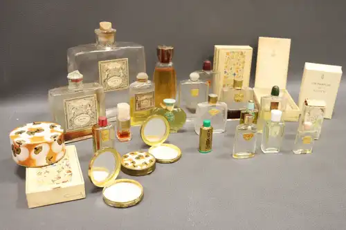 Lot de vingt-six flacons de parfum et miniatures vintages comprenant : - GUCCI, "Parfum 1" ; - MURY, "Le Narcisse Bleu" ; - COUDRAY, "Fougère" dans sa boîte ; - GUERLAIN, "Shalimar" ; - LENTHERIC, "Shanghai" dans sa boîte (plein) ; LERYS, "Le Muguet" ; - MONSAVON, "Cuir" (plein) ; - MITSUKO ; - FORVIL, "Lavande" ; - Jean D'ALBRET, "Ecusson" (plein) ; - PFIRSICH, "The Digger's Garden" (plein) ; - Judith MULLER, "Bat-Sheba" ; etc.