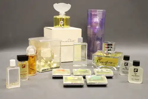 Ensemble de flacons dont CHERAMY, CHEVIGNON, BORSARI, VALENTINO, FRAGONARD, L.T PIVER, MESSIRE, AVON, WEIL, PACO RABANNE, JUSSY, PIERRE BALMAIN, BERDOUES, NINA RICCI, UNRAGO, GIANNI VERSACE, NAF NAF, LAGERFELD, CHARLES JOURDAN.